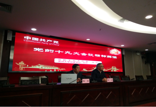 贵大新闻网讯(两办 李旭峰) 12月29日,党的十九大代表、省委宣讲团成员、贵州大学党委书记、校长陈坚到贵州省民盟作“党的十九大会议精神解读”的宣讲报告。宣讲报告会由贵州省人民政府副省长、民盟中央常委、贵州省委主委何力主持。